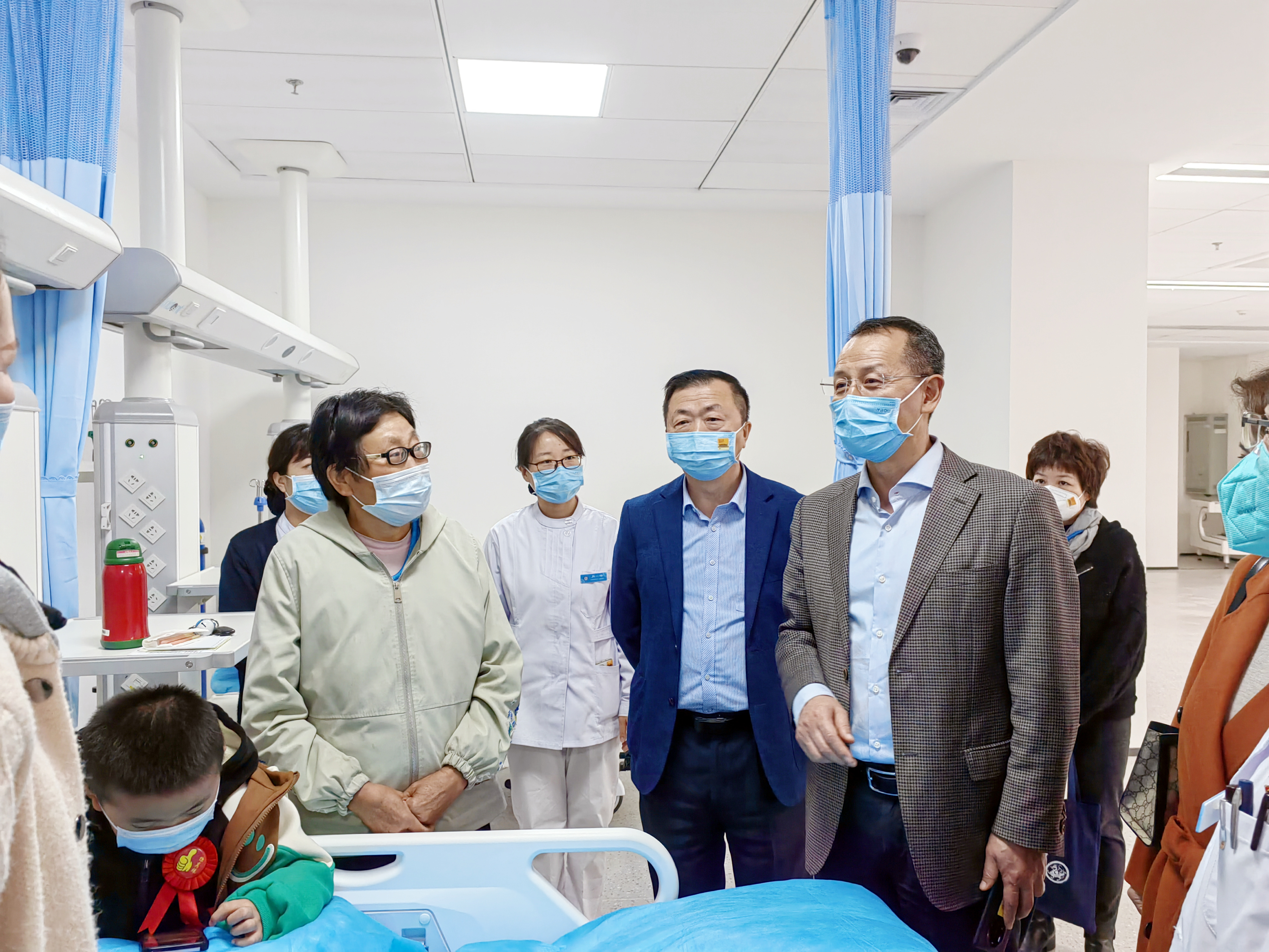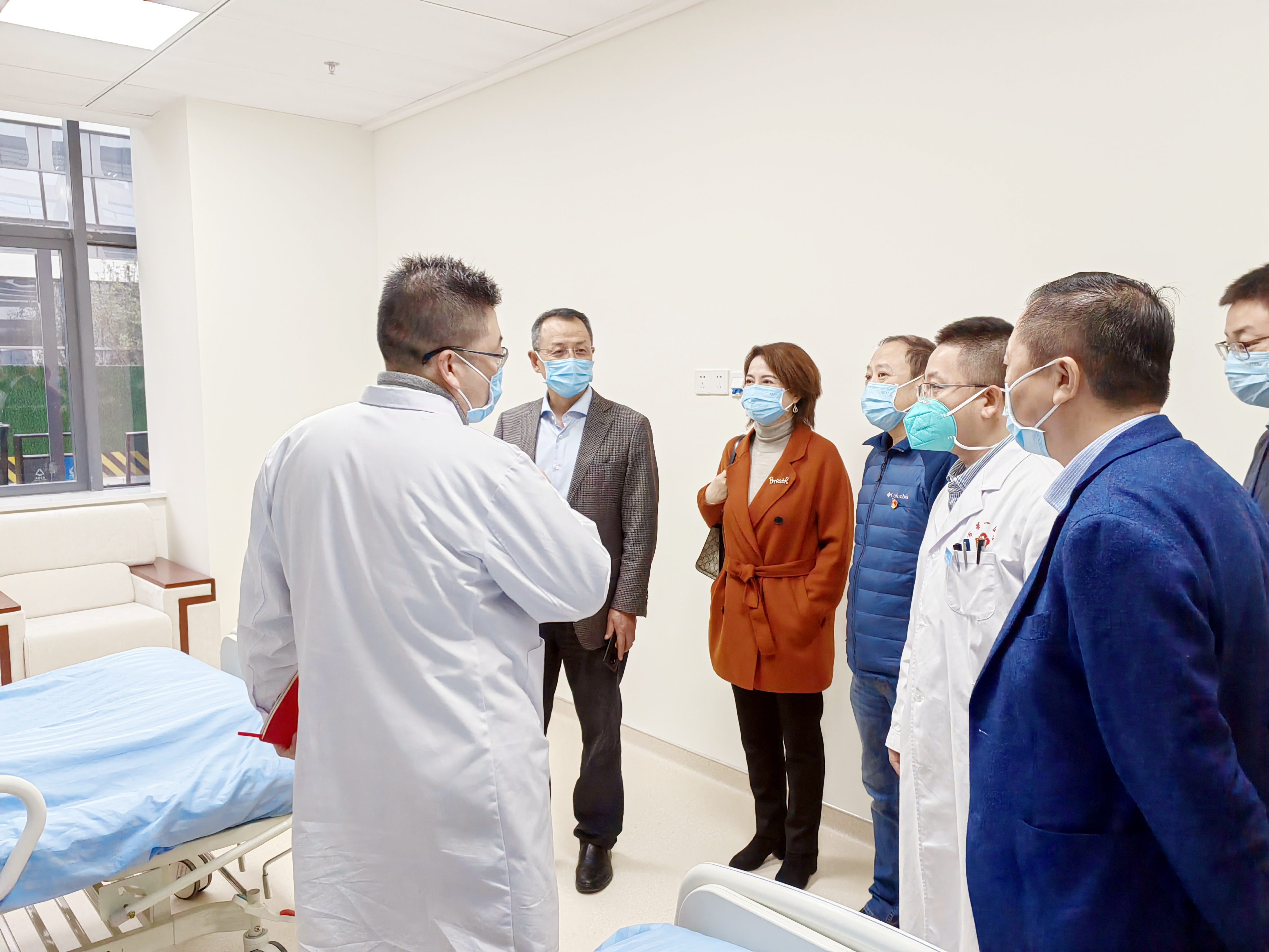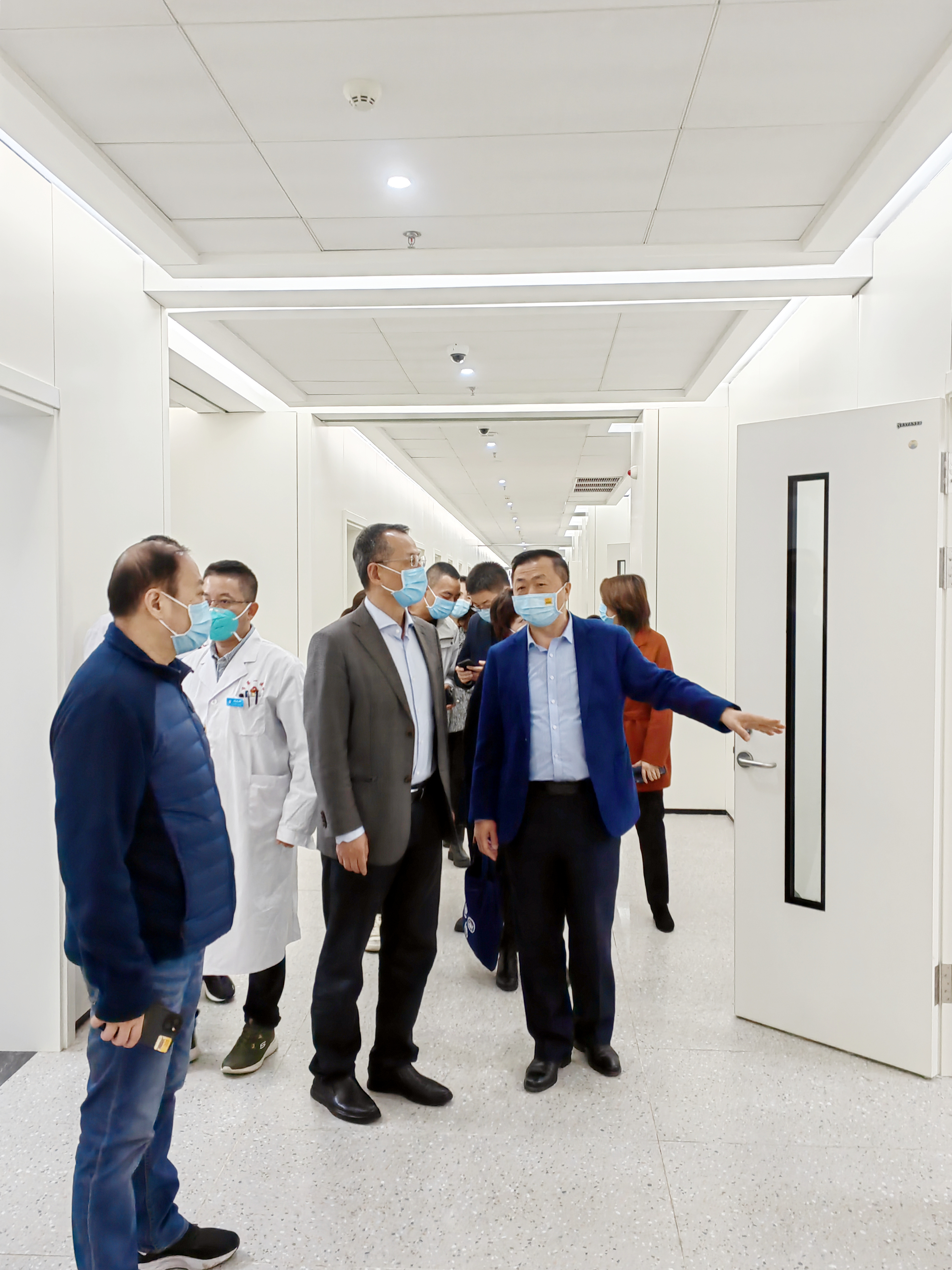 一行人一一巡视诊室及病区,全面了解目前开诊科室的运营状况,调研还需改进的方面,并与一线人员开展深入交流,对新院区启用后的功能分区、科室布局、学科建设、设备使用、后勤保障及疫情防控等方面的实际运行效果作了细致沟通,就新院区如何更平稳、更高效的良好运营集思广益。