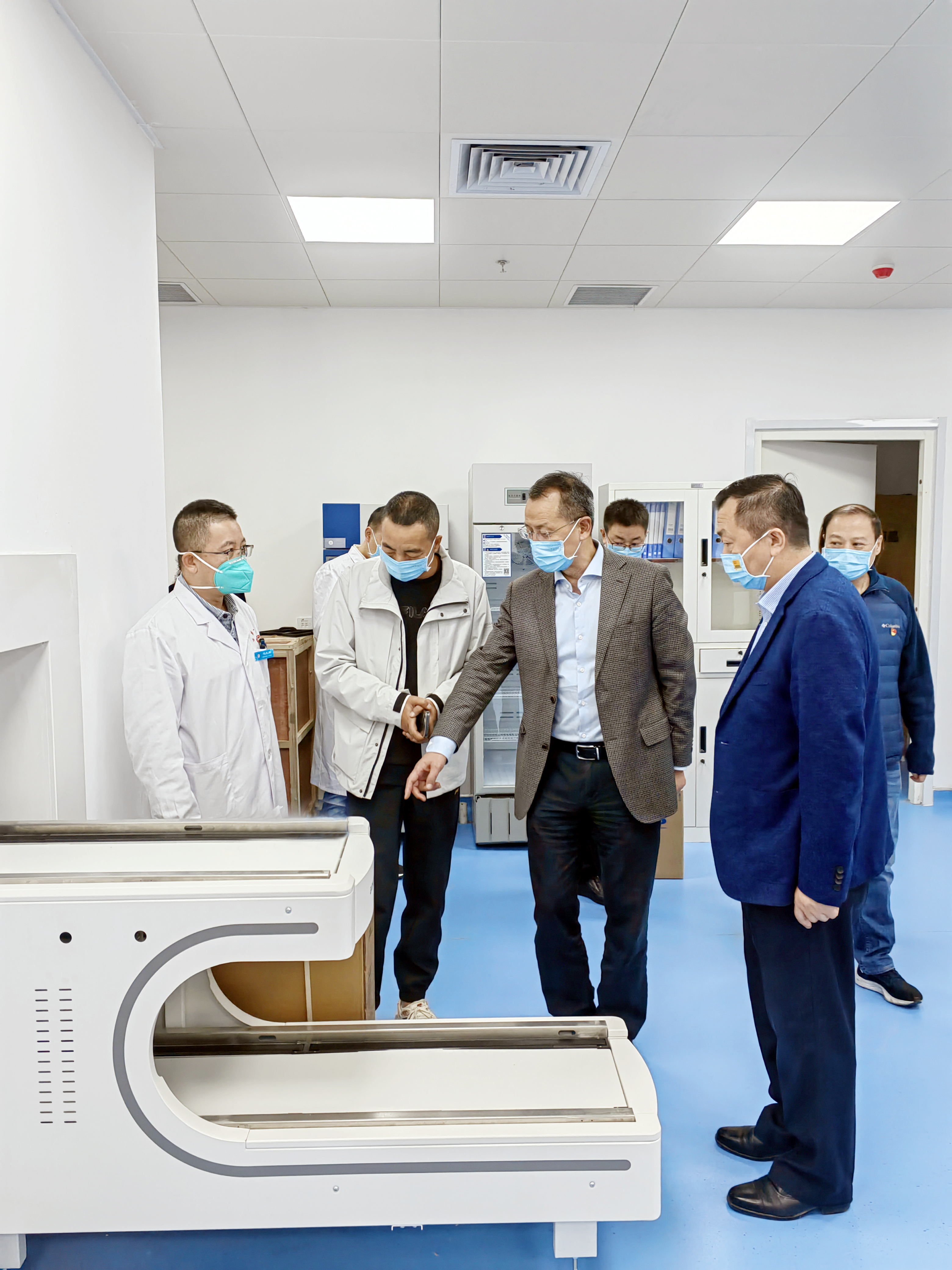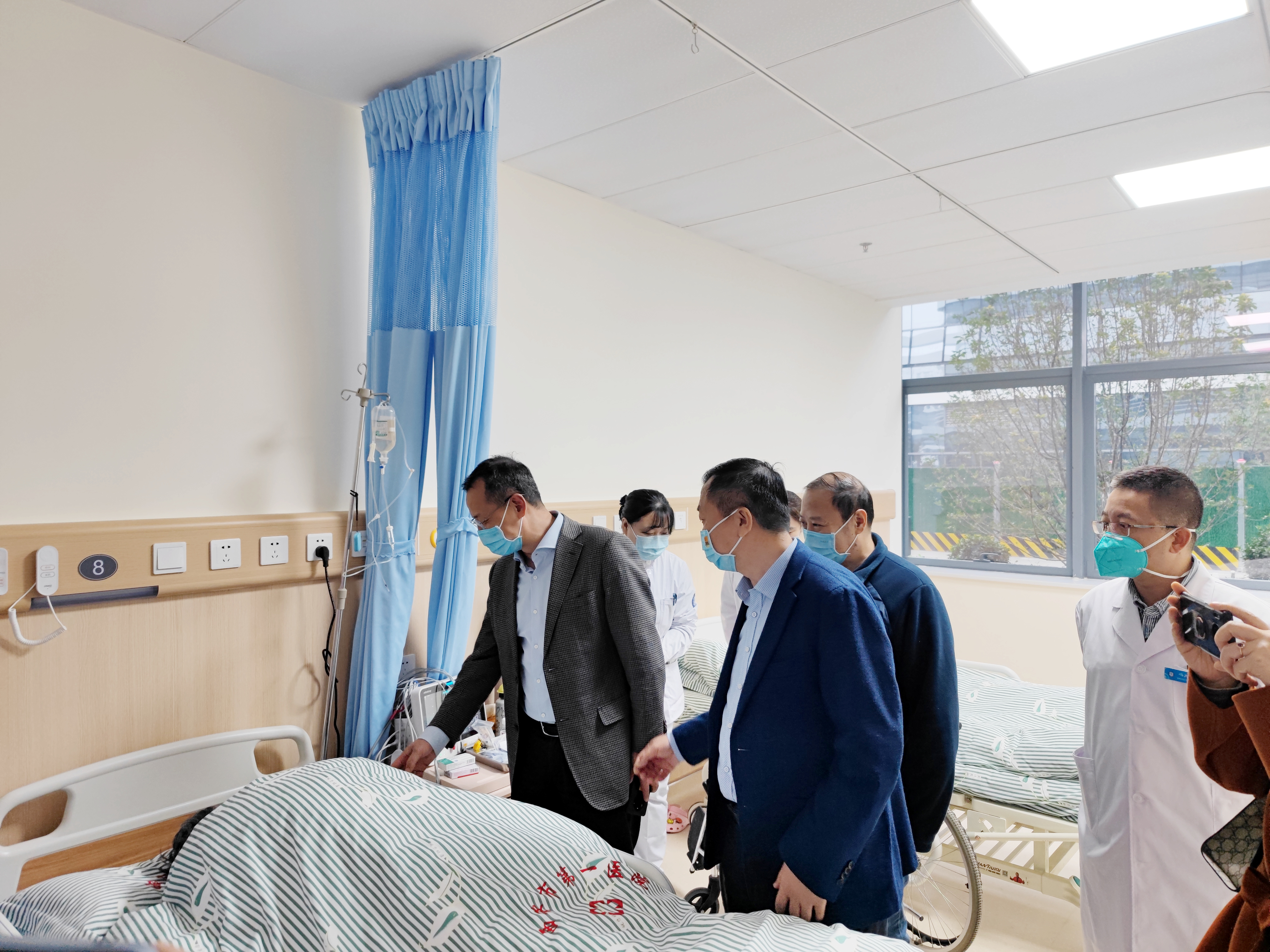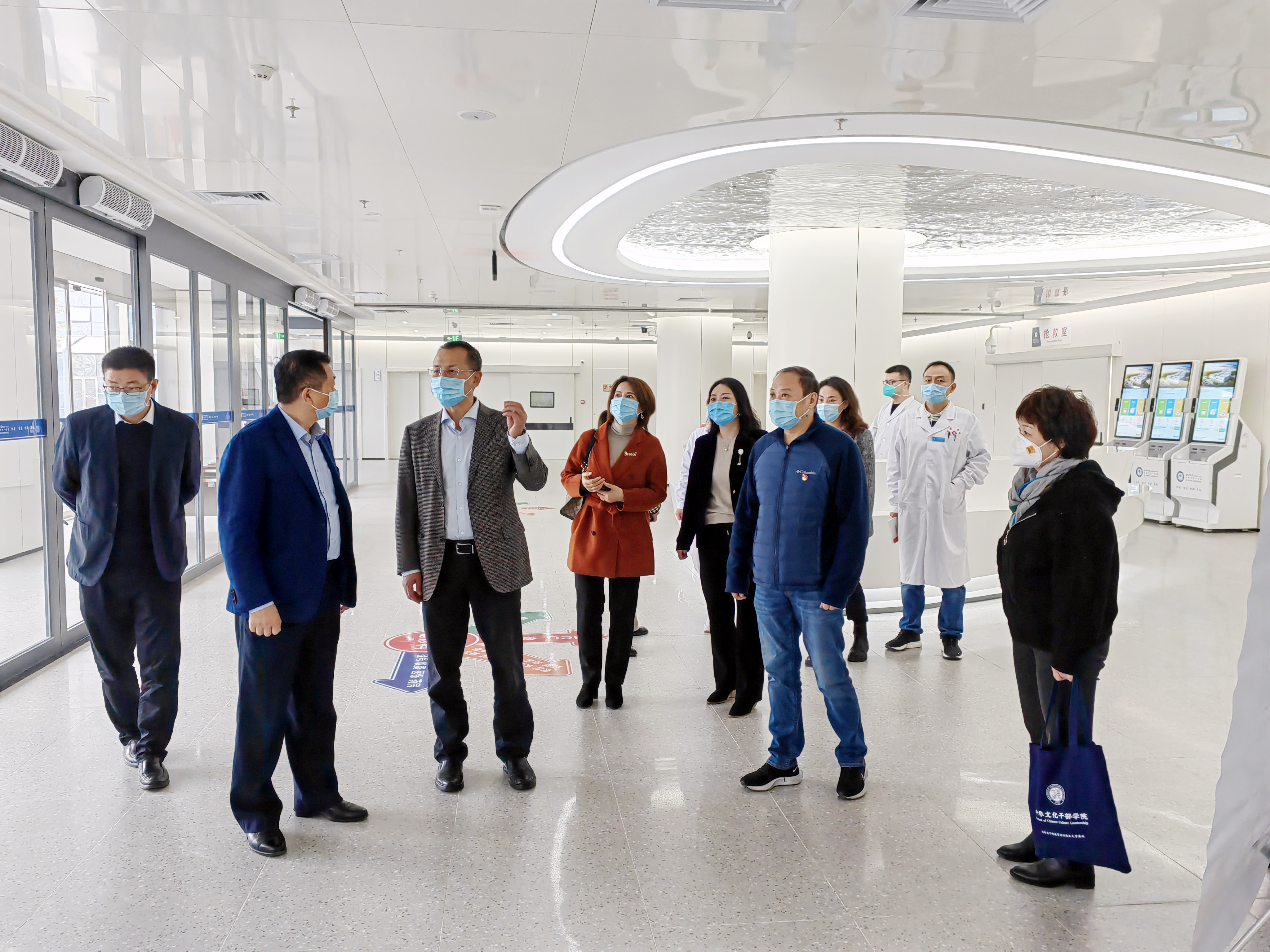 一行人一一巡视诊室及病区,全面了解目前开诊科室的运营状况,调研还需改进的方面,并与一线人员开展深入交流,对新院区启用后的功能分区、科室布局、学科建设、设备使用、后勤保障及疫情防控等方面的实际运行效果作了细致沟通,就新院区如何更平稳、更高效的良好运营集思广益。