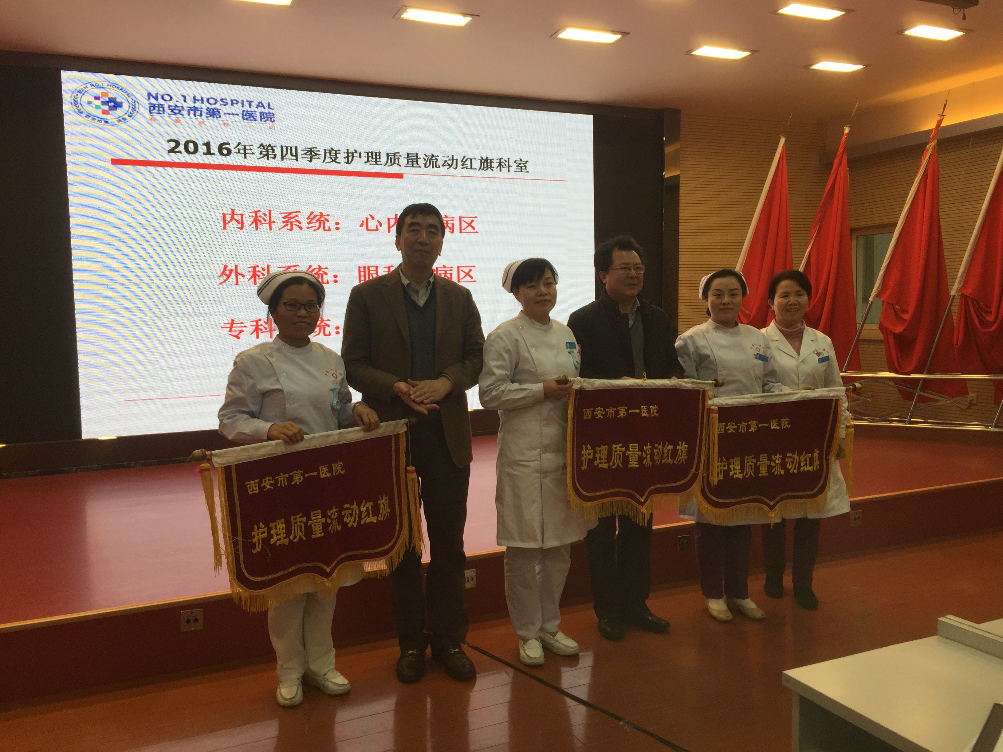 会上,护理部主任张娟娟对第四季度护理质量考核工作进行了汇报,她从护理质量评价计划、现场督导、数据汇总、持续改进等方面阐述了四季度护理质量考核评选方式和流程,通过考核评选,共有三个系统的三个科室获得了“护理质量流动红旗”。分别为:内科系统的心内三病区、外科系统的眼科三病区、专科系统的眼科手术室。院长张世明、书记崔明远、主管护理的纪委书记白敏芳为这三个科室颁发了流动红旗。