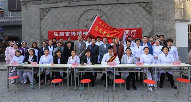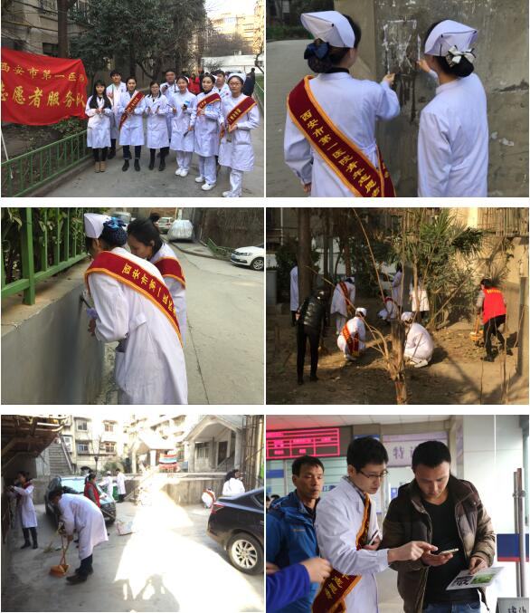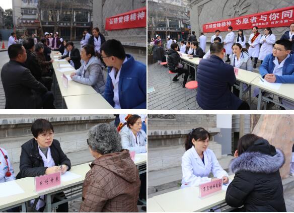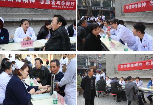 仪式结束后,党团员志愿者团队分为两队,第一队由内科、外科、心血管科、疼痛科、耳鼻喉科专家党员志愿者组成,前往德福巷社区进行学雷锋义诊活动。义诊现场,附近居民纷纷前来咨询,专家为他们进行健康检查后,并就咨询内容进行详细解答,给予合理的就医用药建议,免费发放药品,受到社区居民的热烈欢迎。第二队由团员志愿者组成,开展进社区志愿服务活动,志愿者们在社区内捡拾烟头及垃圾,对吸烟者进行劝阻,志愿者们还到一名患有艾滋病的贫困居民家中进行了慰问帮扶。