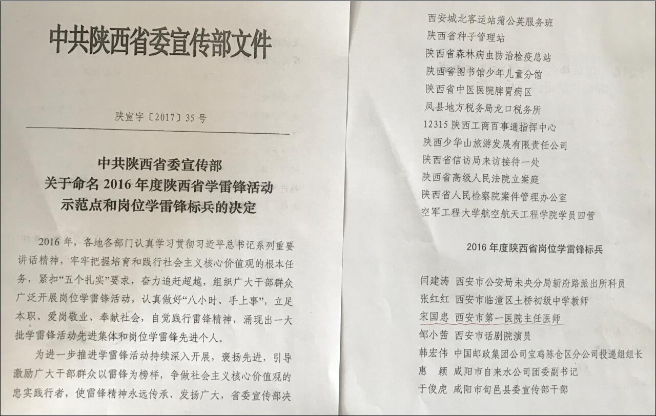 副院长宋国忠被中共陕西省省委宣传部评选为“陕西省年度岗位学雷锋标兵”,2016年7月,宋国忠同志作为中国援苏丹光明行医疗队的队长,带领陕西省男同视频