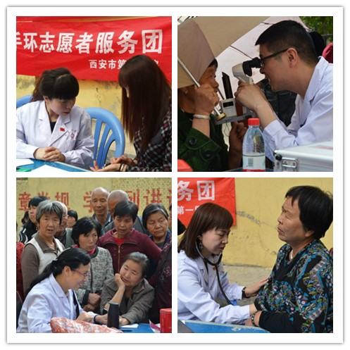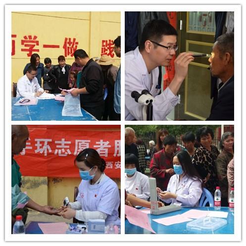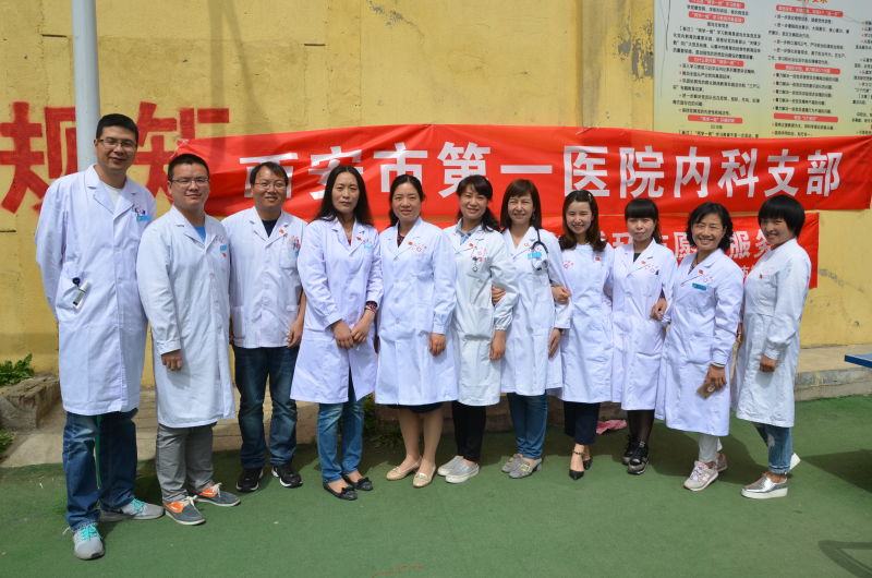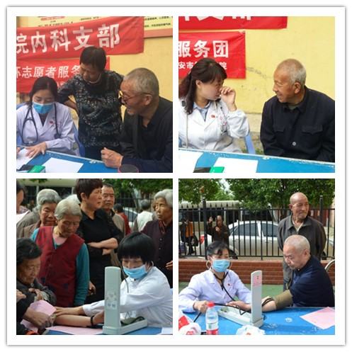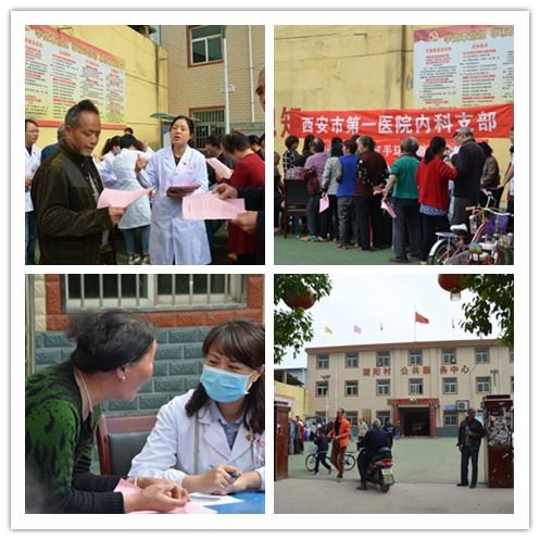 内科党支部医护人员以“优质资源下基层 惠泽一方百姓”为主题前往西安市长安区蒲阳村下乡义诊,在蒲阳村党员之家广场门前举办了义诊系列活动。本次义诊活动由内科党支部书记李延带队,成员来自消化科、呼吸科、肾脏内分泌科、神经内科的医生、护士党员们。活动特邀嘉宾为中医科戴晓萍医师、眼科郑博医师,他们成为本次活动现场最受欢迎的医师之一,受到了当地老百姓的热烈欢迎与赞赏。