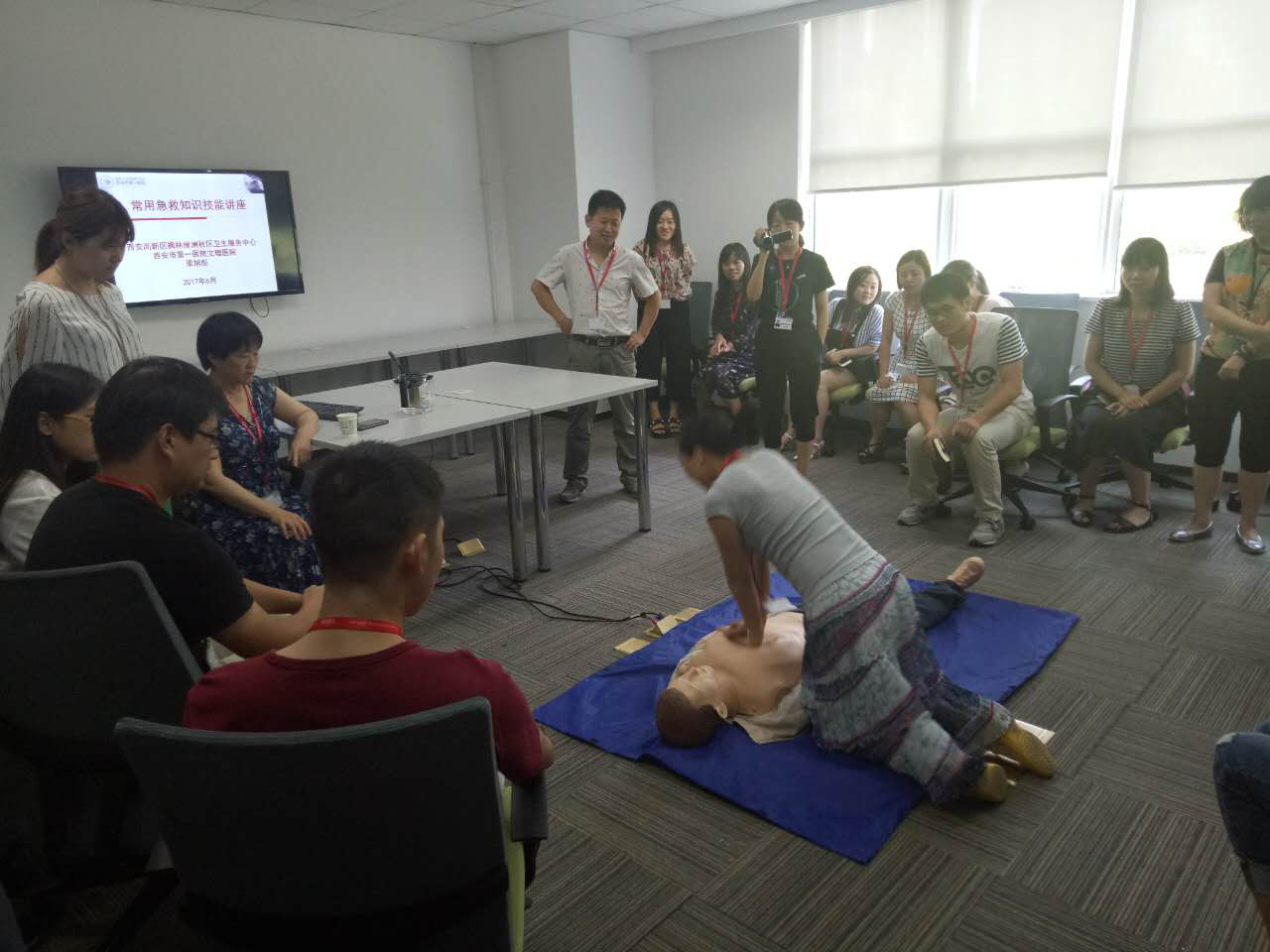 随着社会发展,生活节奏加快和生活水平的提高,心血管疾病突发致死率居首位,自然灾害、交通事故等伤害严重威胁人们的生命。为了使更多的人掌握急救知识和技能,2017年6月28日下午,应富士通(西安)系统工程有限公司邀请,文理医院暨枫林绿洲社区卫生中心医务人员为富士通全体员工进行了常用急救知识技能培训。