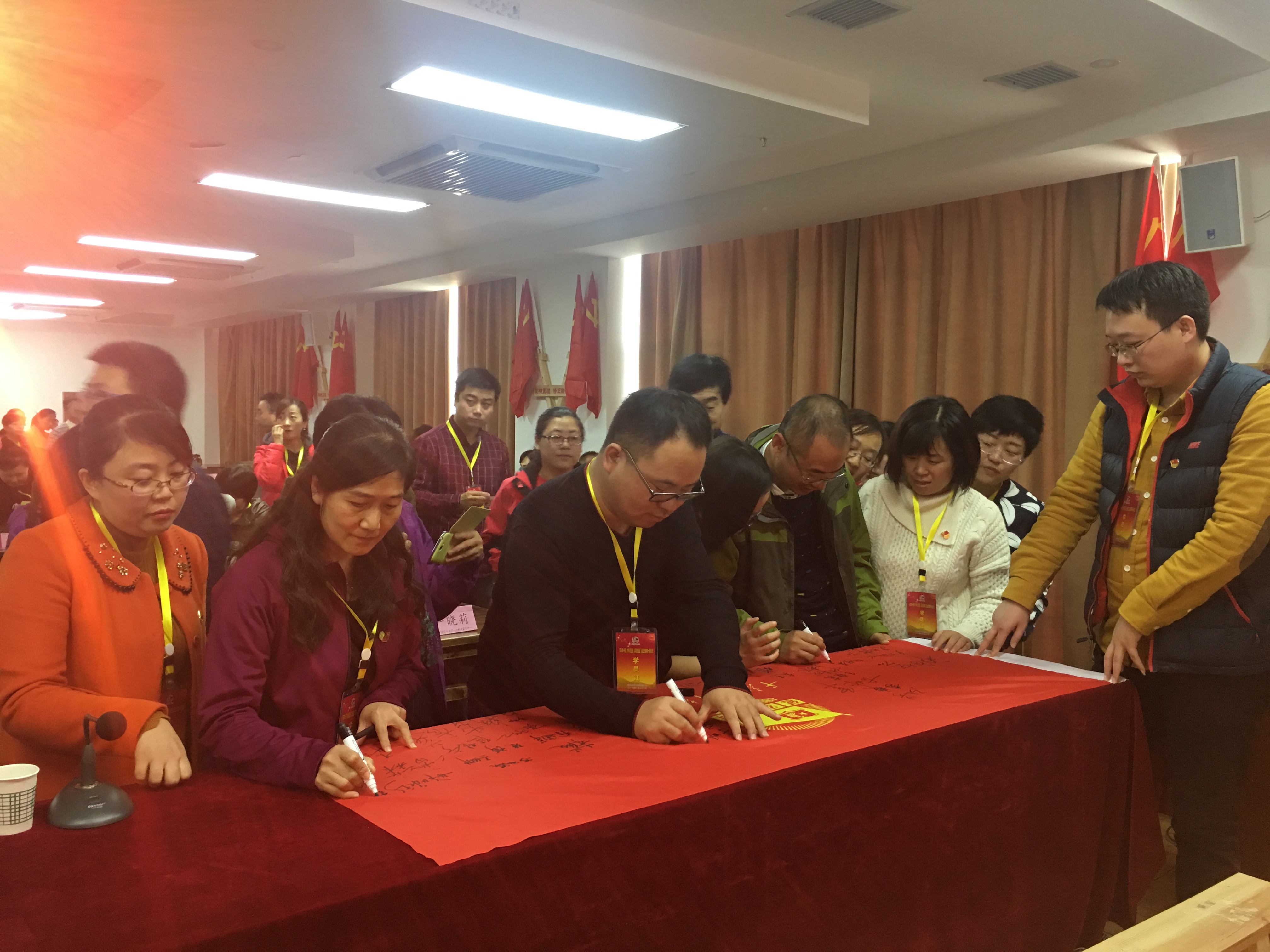 红色教育队旗上签名。