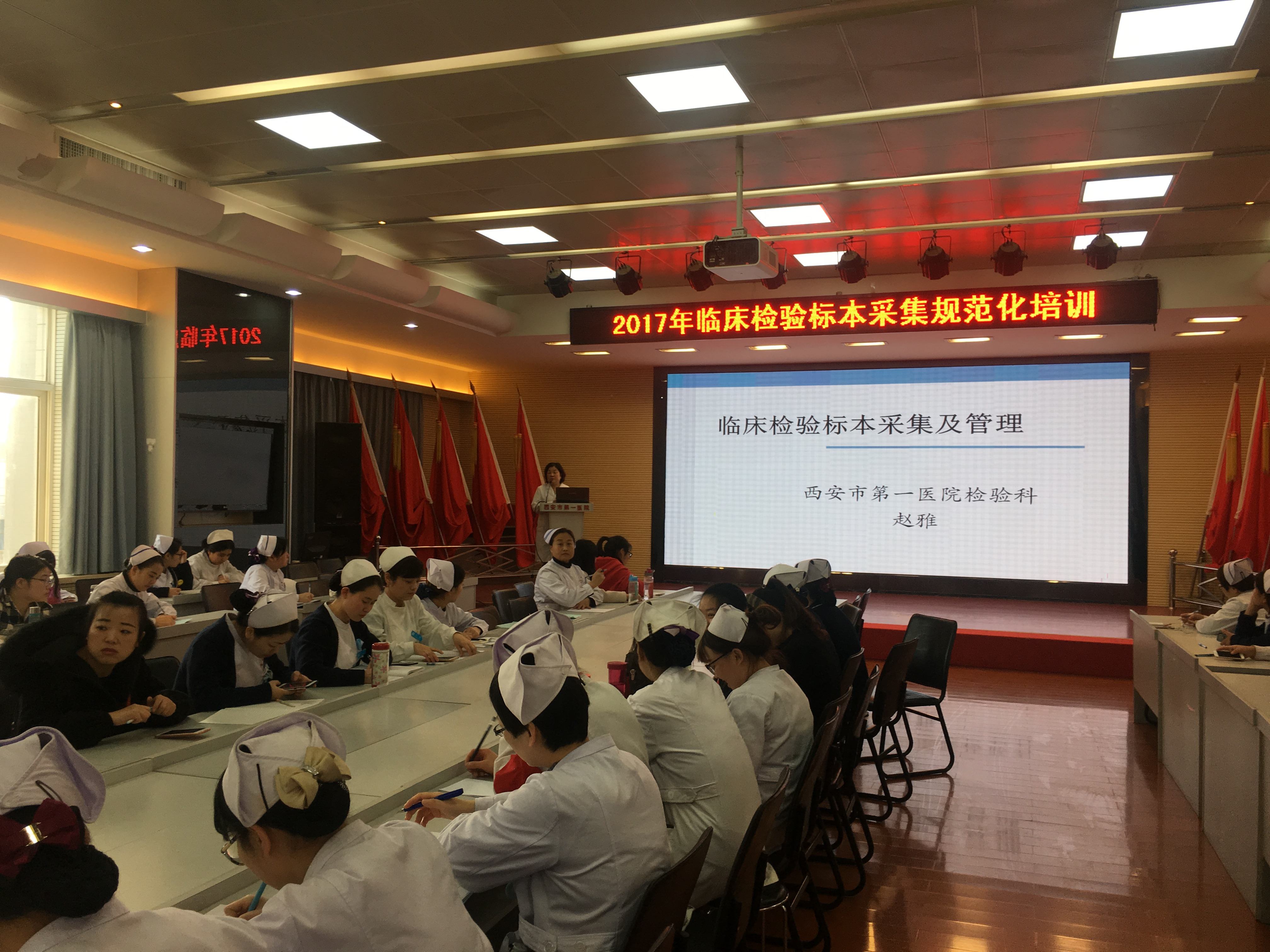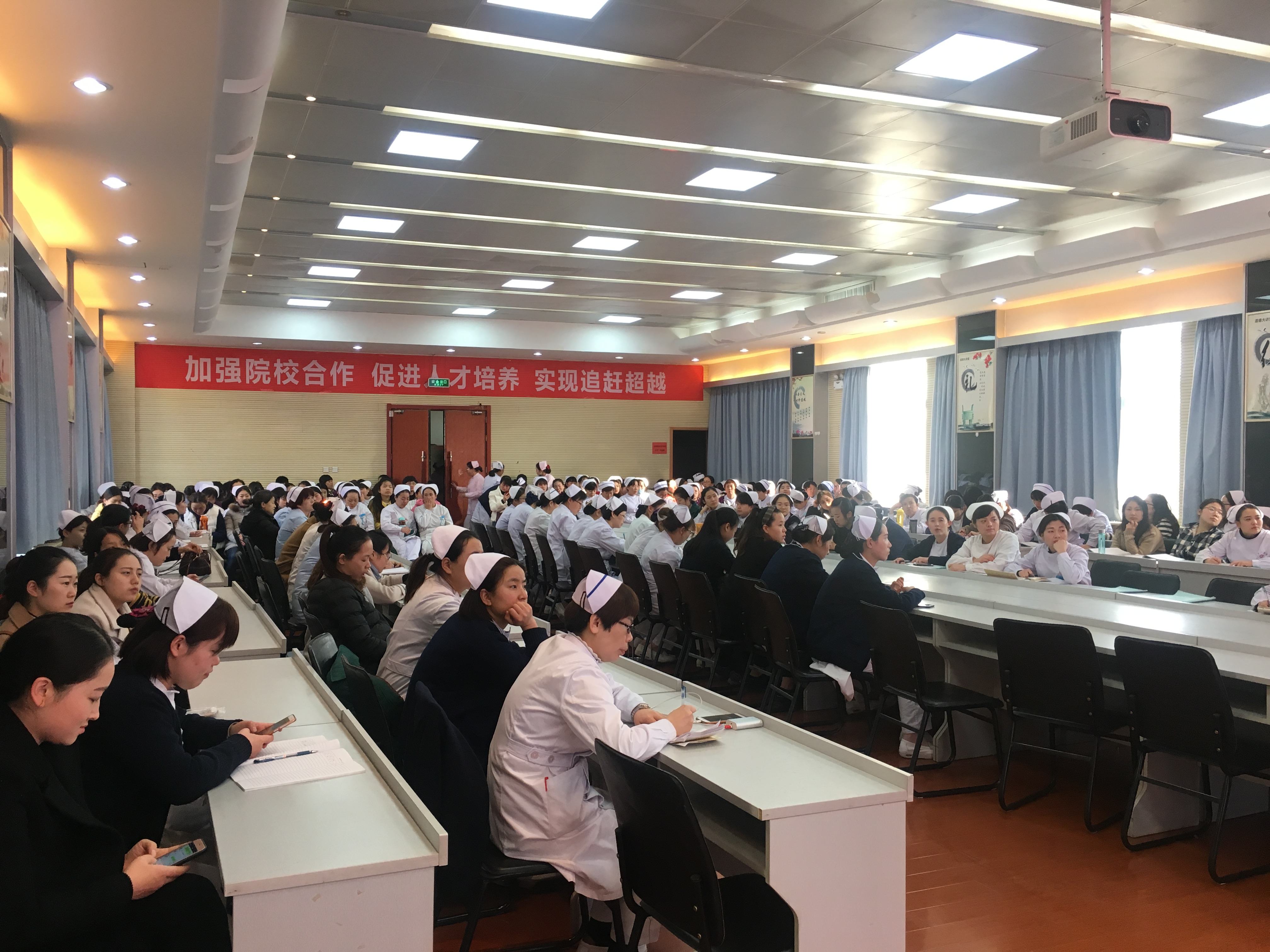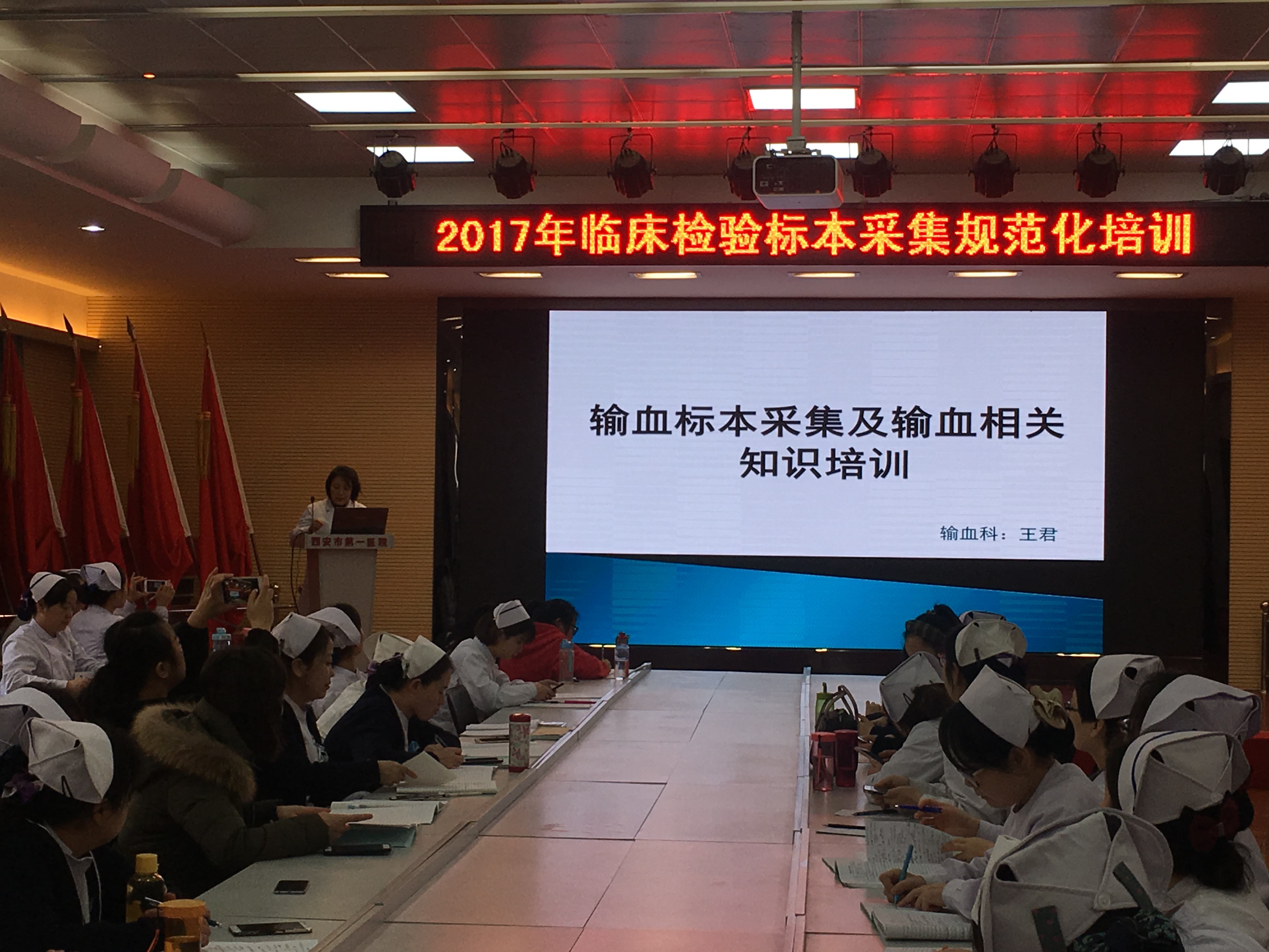 检验科主任赵雅和输血科副主任王君为全院护理人员进行临床检验标本采集规范化培训,本次会议由护理部副主任任燕萍主持,全院护理人员约三百人参加。