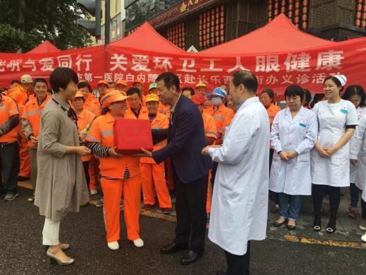 派出技术精湛的眼科团队,携带专业检测仪器,为辛勤工作的环卫工人献上节日的问候及关怀 "。邢海柱书记代表医院赠送长乐西路街办价值4000元的药品,其中包括制剂室提供的价值3000元的眼药。