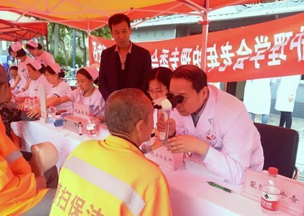 义诊活动现场人潮涌动、气氛热烈。义诊项目丰富,包括测血压、视力检查、裂隙灯检查、眼压检查、眼底镜检查等。被誉为“马路天使”和“城市美容师”的环卫工人,常年在室外工作,环境相对艰苦,眼睛长期受到紫外线的照射,以及粉尘、废气的影响,特别容易发生白内障、干眼症、结膜炎、沙眼、翼状胬肉灯等眼科疾病。