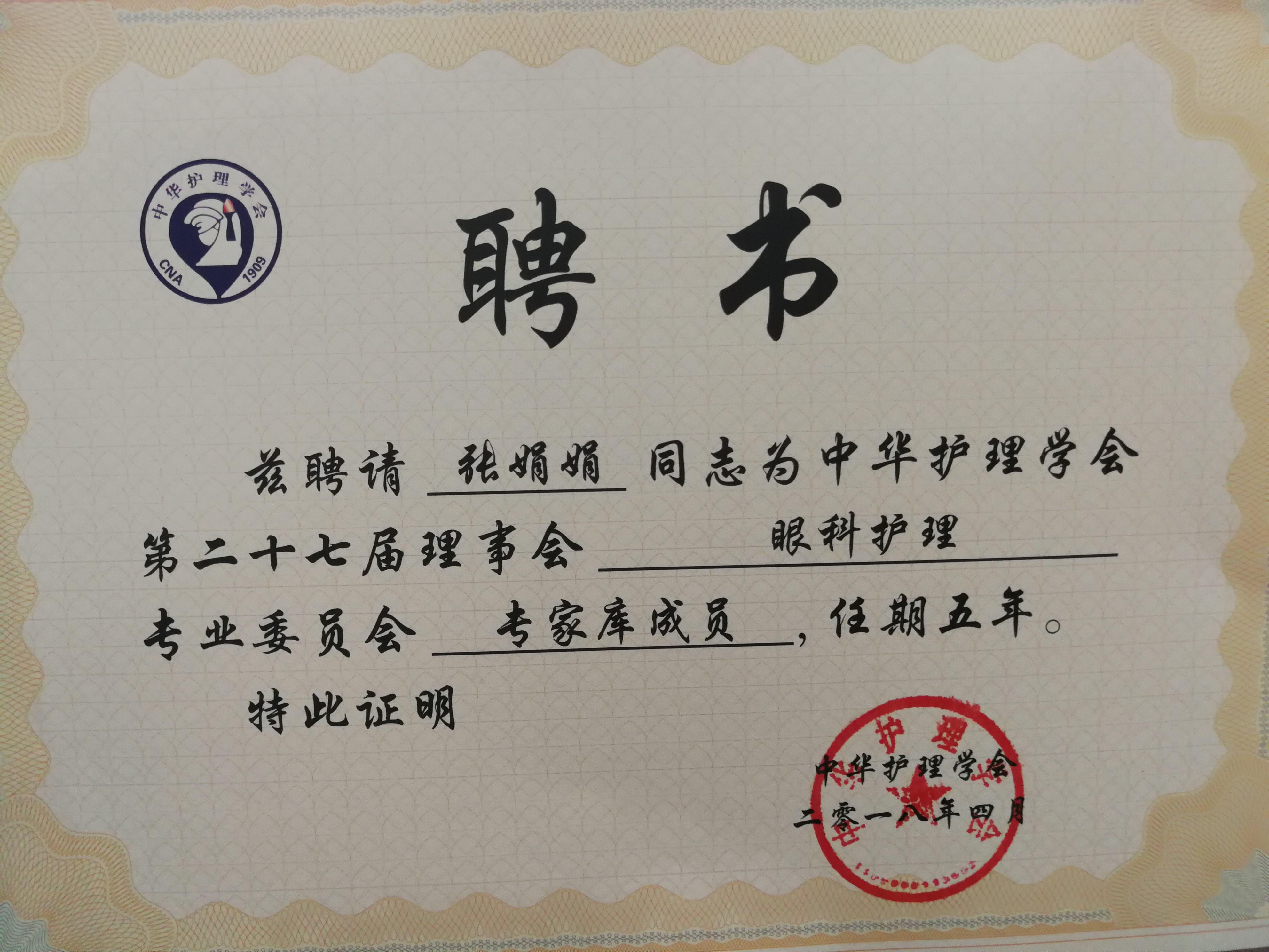 张娟娟主任当选中华护理学会眼科专委会专家库副组长