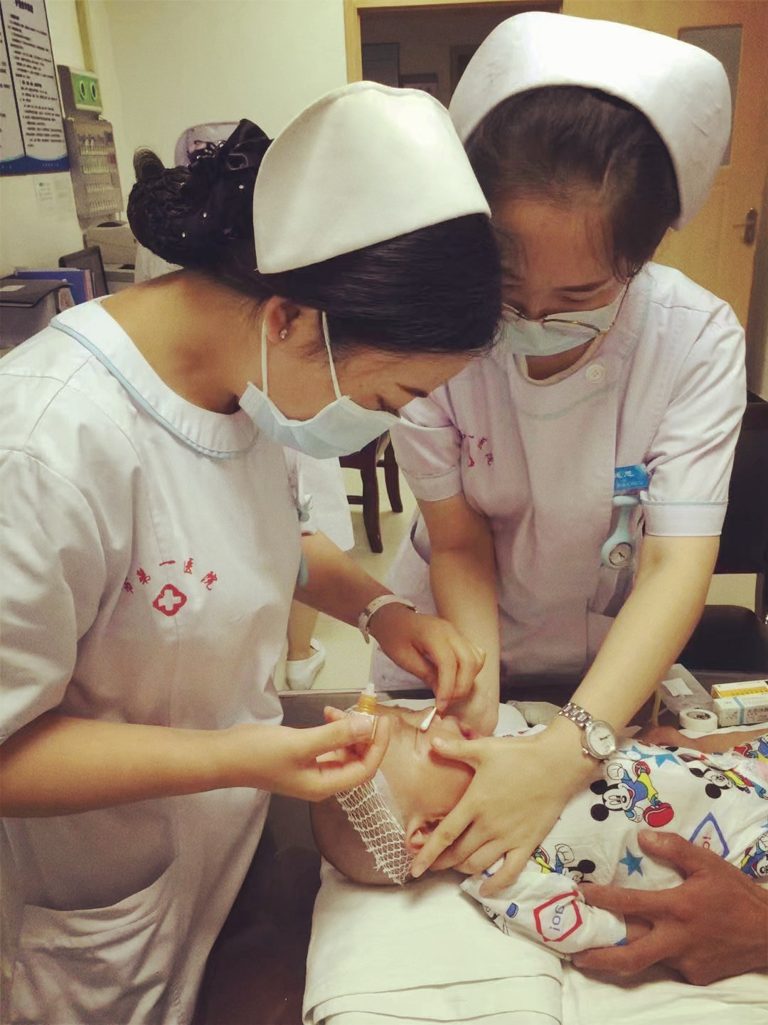 治疗。患儿眼科手术前,由于家属照顾不周,感染致支气管肺炎收住儿科。孩子妈妈由于高血压、常年生病,无法前来照顾,陪同的爸爸不会汉语,舅舅只会用简短的汉语进行沟通。在治疗过程中,细心的她发现孩子脸上有划烂的痕迹,头上结了一层厚厚胎脂,手指甲很长,听孩子舅舅说,他们当地的孩子出生后从来不洗澡,所以孩子囟门上方有一层厚厚的胎脂,她立即给孩子进行了清洁护理,剃除了头上的胎脂,同时为孩子剪去了长长的指甲,小家伙顿时清爽了许多。期间患儿一直在哭闹,有经验的她发现原来孩子是饿了,她便为孩子冲好奶粉,很快孩子乖乖地喝着奶,在她的怀里香甜的睡着了。于是,她立即打开厚包裹及尿不湿,发现身上和臀部全是红疹,臀部已部分溃烂,她一边带领家属去买婴儿夏天的衣裤,一边亲自用温水给患儿清洗全身,做臀部护理,耐心地给家属讲解护理的各种细节。很快在她的精心照顾下,孩子身上及臀部皮肤有了明显的好转。