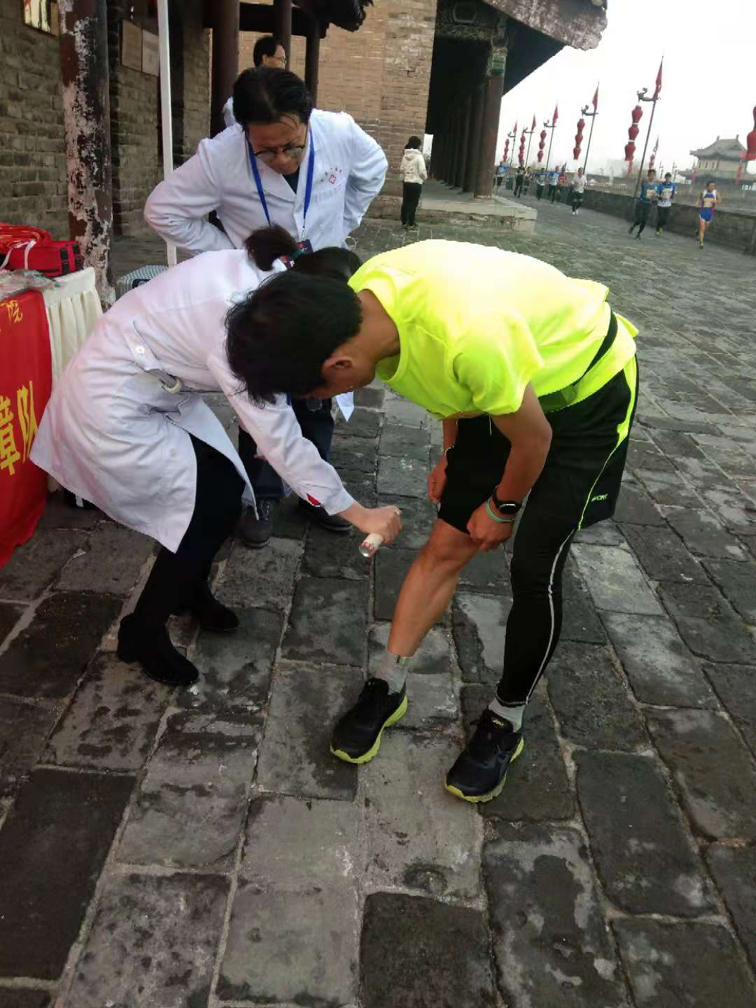 负责马拉松赛7号(西门)、8号(西南角)保障点的医疗救护任务。下午2:00,男同视频