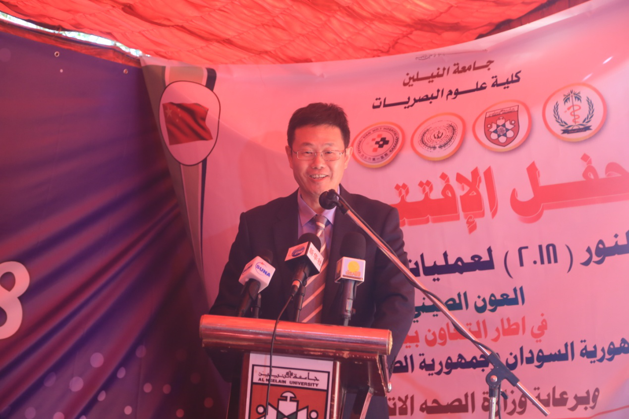 周春林参赞致辞时表示“光明行”活动是习近平主席在9月初中非合作论坛北京峰会上提出的8大重要创新之一,2016年中国派出的光明行项目组为苏丹1041名白内障患者迎来光明,在苏丹百姓间传为佳话。此次2018中国援苏丹“光明行”项目作为 “中国•苏丹合作的一部分”,由苏丹喀土穆州政府卫生部和中国驻苏丹大使馆经商处共同发起、并共同命名为“光明行动2018”,希望通过短期医疗项目推动苏丹公共卫生事业的发展、并再次见证中苏两国友好建交以来的深情厚谊。