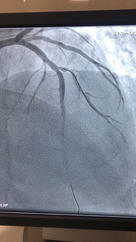此例患者,男性,56岁,11年前因心绞痛在西京医院行冠状动脉造影检查后于D1对角支置入1枚支架治疗。术后患者口服“阿司匹林肠溶片、氯吡格雷、阿托伐他汀”等药物治疗1年后自行停药,并有长期大量吸烟史。2018年12月24日患者突发胸痛、胸闷,急来男同视频
