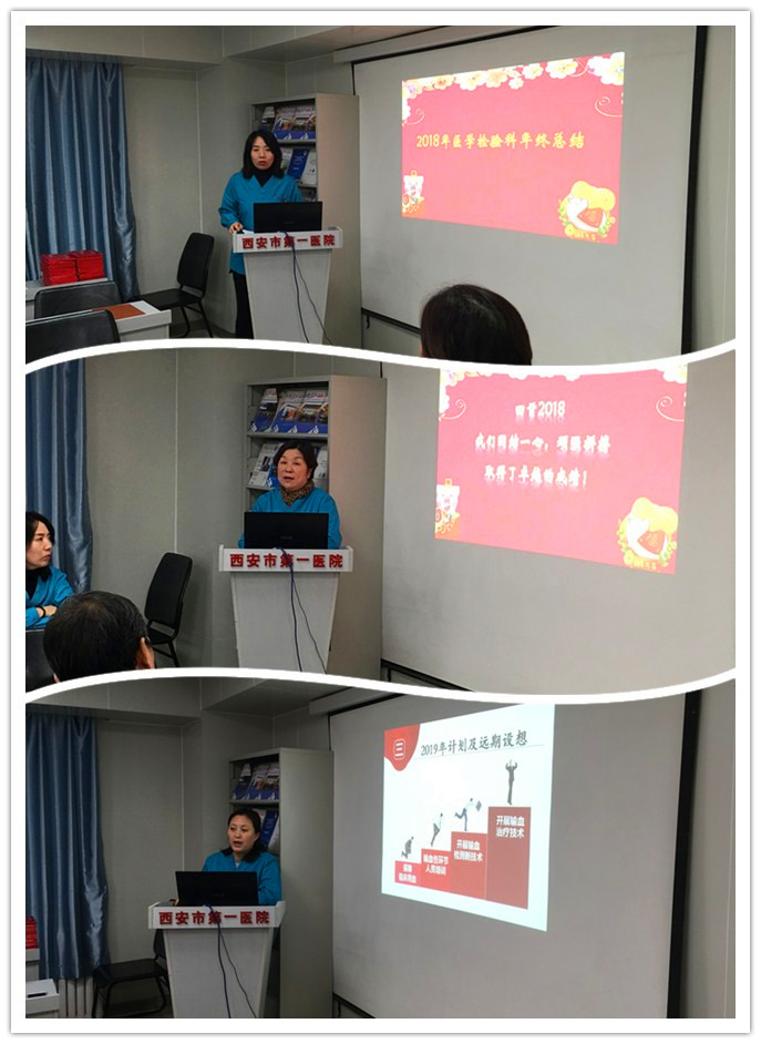 首先由医学检验科赵雅主任就2018年医学检验工作及2019年工作计划做总结发言,2018年医学检验科在院党委和院领导的坚强领导下,上下齐心,团结协作,攻坚克难,出色地完成了全年的各项工作任务,赵雅主任分别从科室管理、工作量和经济效益、学术活动、科研和发表论文等方面进行总结。输血科王君副主任对医院2018年用血情况及后续输血科的发展方向进行了总结汇报。