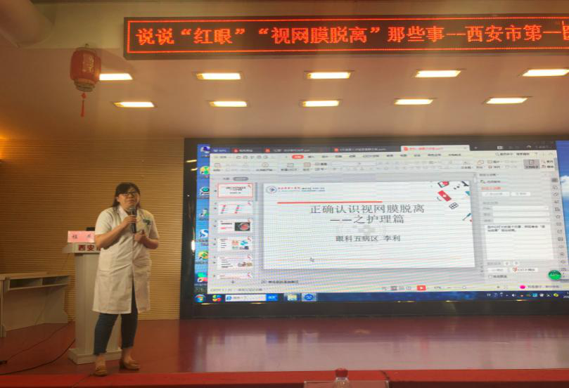 俗话说三分治疗,七分护理,可见护理的重要性,由李利护师解读“正确认识视网膜脱离-之护理篇”,讲解视网膜脱离术后采取哪种卧位姿势,生活中可以通过眼保健操达到护眼效果,并现场为大家示范握拳点眼法,现场观众纷纷效仿学习。