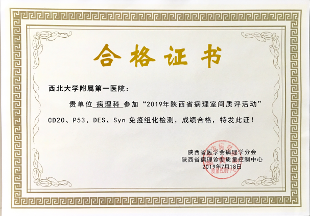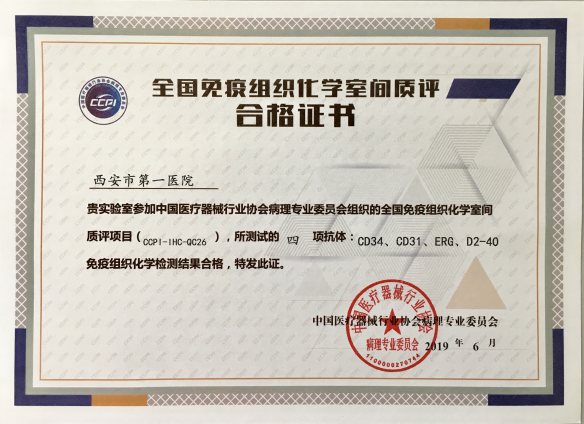病理科在2019年4月及6月分别参加了由中国医疗器械行业协会病理专业委员会(CCPI)举办的全国第26次免疫组化室间质评活动及由陕西省医学会病理学分会与陕西省病理诊断质控中心联合举办的陕西省免疫组化室间质评活动,两次质控活动均成功取得室间质评合格证书,再获佳绩。