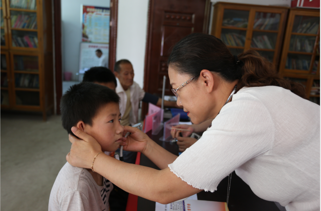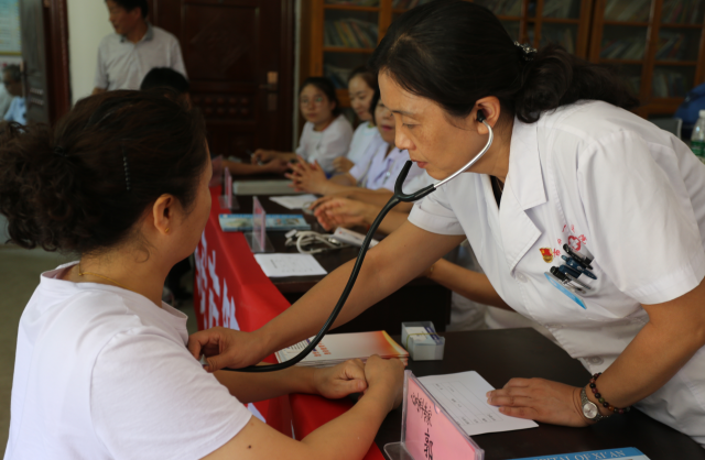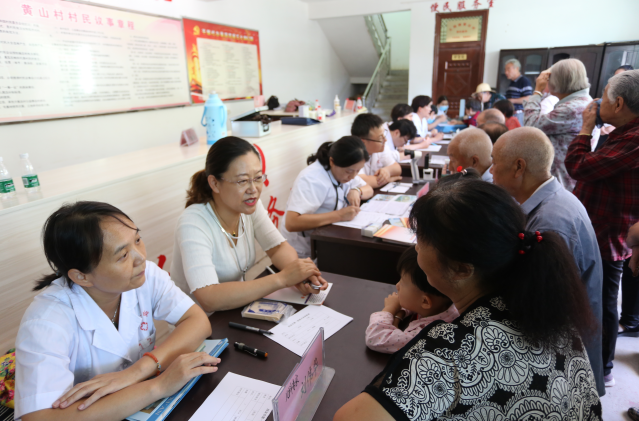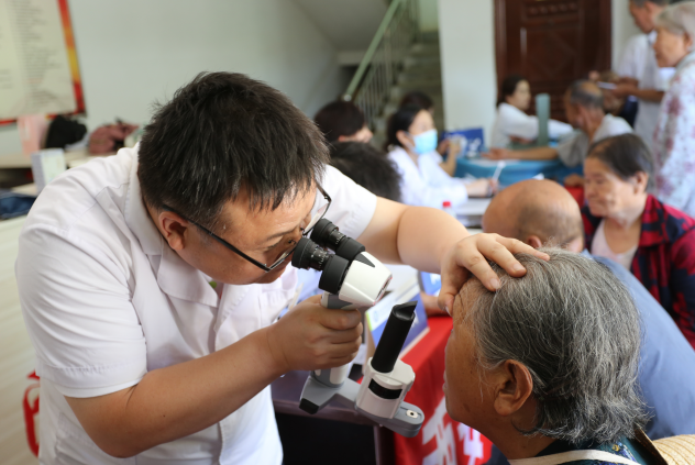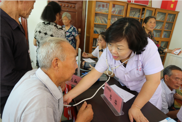 义诊现场,医护人员为村民免费提供诊疗、测血压、测血糖及健康咨询等服务。烈日炎炎,前来义诊的村民们络绎不绝,但医务人员无畏酷暑,针对农村常见的如白内障、高血压、心脏病等疾病进行初步筛查、诊断,专家们详细了解每位患者的病史、身体状况,耐心细致地对村民询问的健康疾病问题进行解答,并对日常保健、常见病、多发病的预防进行指导,帮助村民掌握基本的健康保健知识。对于行动不便的老人及精准扶贫对象,医务人员采用入户的方式,为群众送去免费的医疗服务。