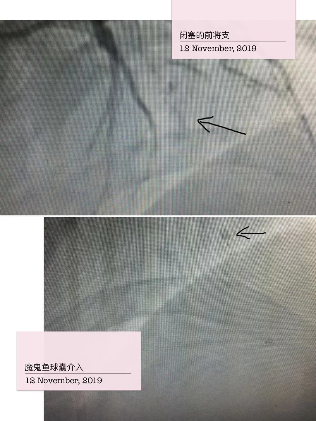 经过充分的术前准备,2019年10月23日由赵朝主任、陆艳副主任进行冠状动脉造影检查,结果显示冠状动脉严重三支病变,左前降支近段100%闭塞,间隔支向左前降支远段形成侧支循环;回旋支中段100%闭塞,右冠状动脉全程瘤样扩张,远端95%以上狭窄,右向左侧支循环很差(逆向技术使用概率很小)。决定先处理最重要的左前降支。正向技术尝试半小时左右失败,由于CTO闭塞残端开口不清、且自认为有较好的同侧间隔支逆向,转换为同侧逆向技术,由于近远端交通的间隔支血管过度迂曲,导丝尝试3个小时左右均不能到达前降支远段。不认输的我们再次转变术式,在血管内超声的指导下,超滑加硬导丝正向刺破闭塞处纤维帽,及时导丝降级,然而导丝不幸进入血管夹层,双腔微导管、手工ADR反复尝试不能回到远段血管真腔,造影剂已经接近300mL,看来只剩下ADR技术。ADR技术是通过输送stingray球囊到良好着陆区的血管夹层内,通过两个相反方向的标识,使硬导丝重回血管真腔的操作。严格按照流程,多次不懈的尝试,功夫不负有心人,导丝回到了前降支远段血管真腔,接下来就是常规操作,手术圆满成功,整个手术历时超过6小时。