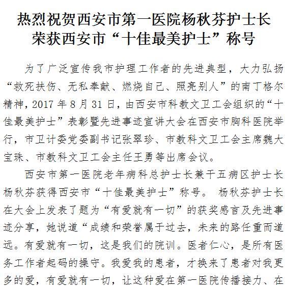 热烈祝贺男同视频 杨秋芬护士长荣获西安市“十佳最美护士”称号