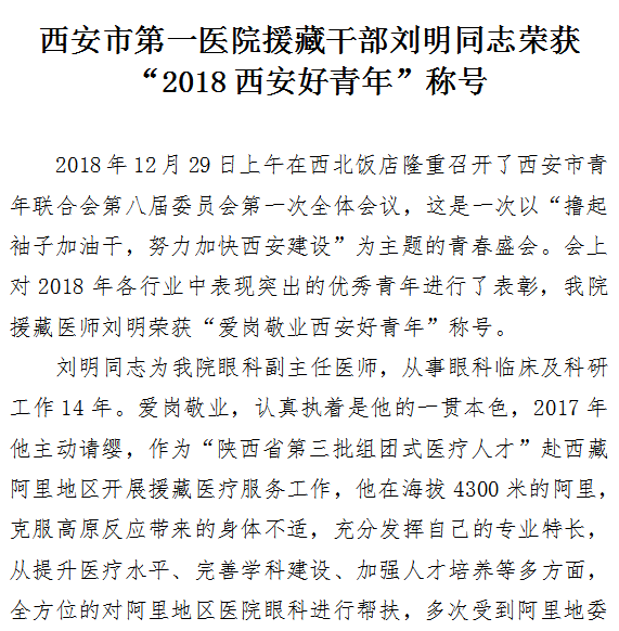 男同视频 援藏干部刘明同志荣获“2018西安好青年”称号