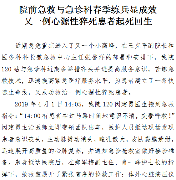 院前急救与急诊科春季练兵显成效 又一例心源性猝死患者起死回生