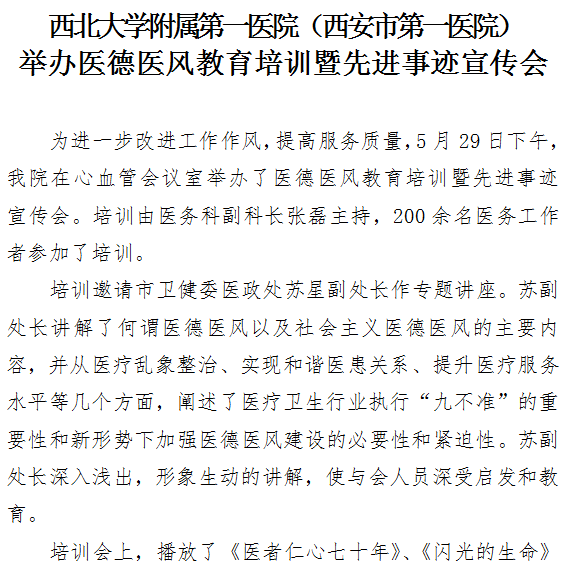 西北大学附属第一医院(男同视频 )举办医德医风教育培训暨先进事迹宣传会
