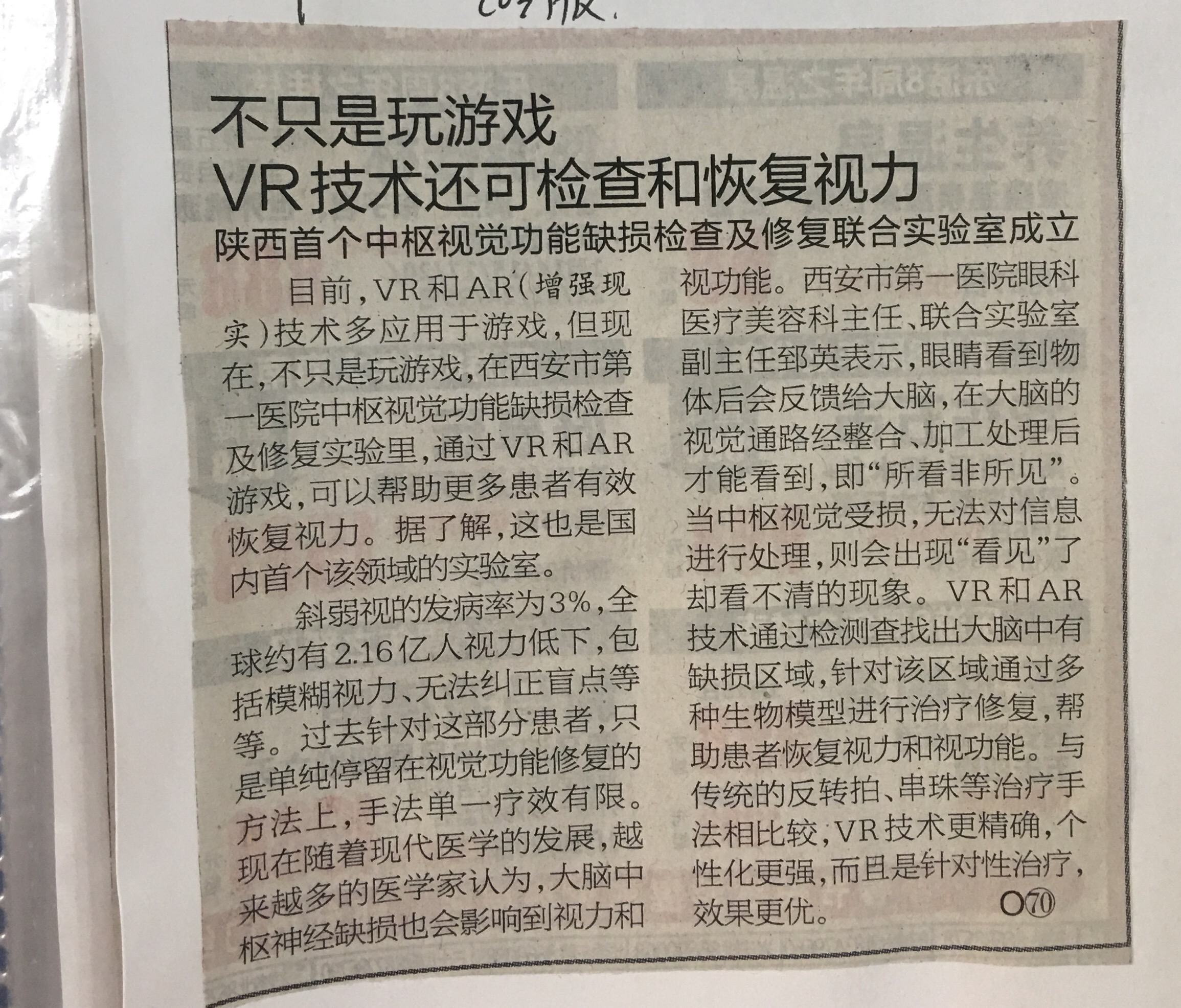 2018.1.10 《华商报》不只是玩游戏VR技术还可检查和恢复视力