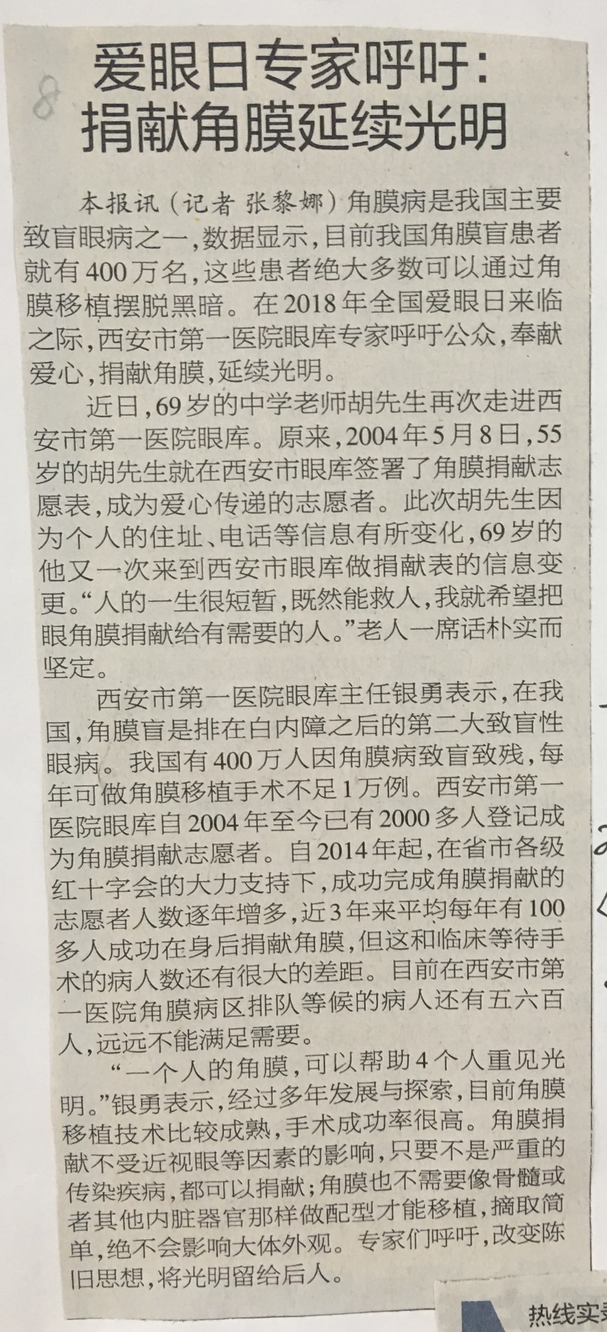 2018.6.6《西安晚报》爱眼日专家呼吁:捐献角膜延续光明