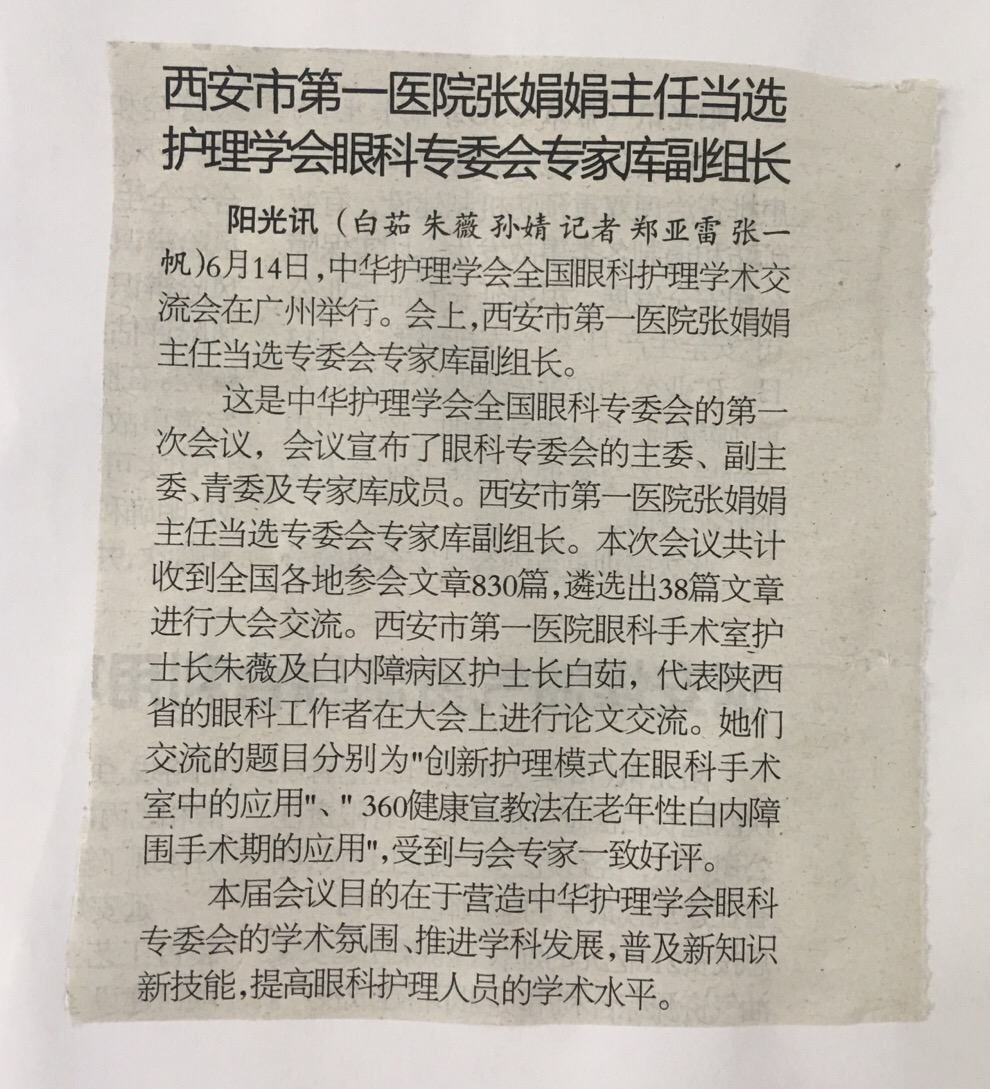 2018.6.15《阳光报》男同视频 张娟娟主任当选护理学会眼科专委会专家库副组长