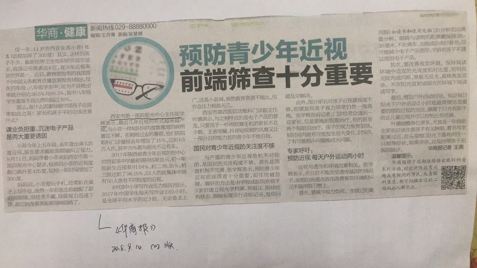 2018.9.14《华商报》预防青少年前端筛查十分重要