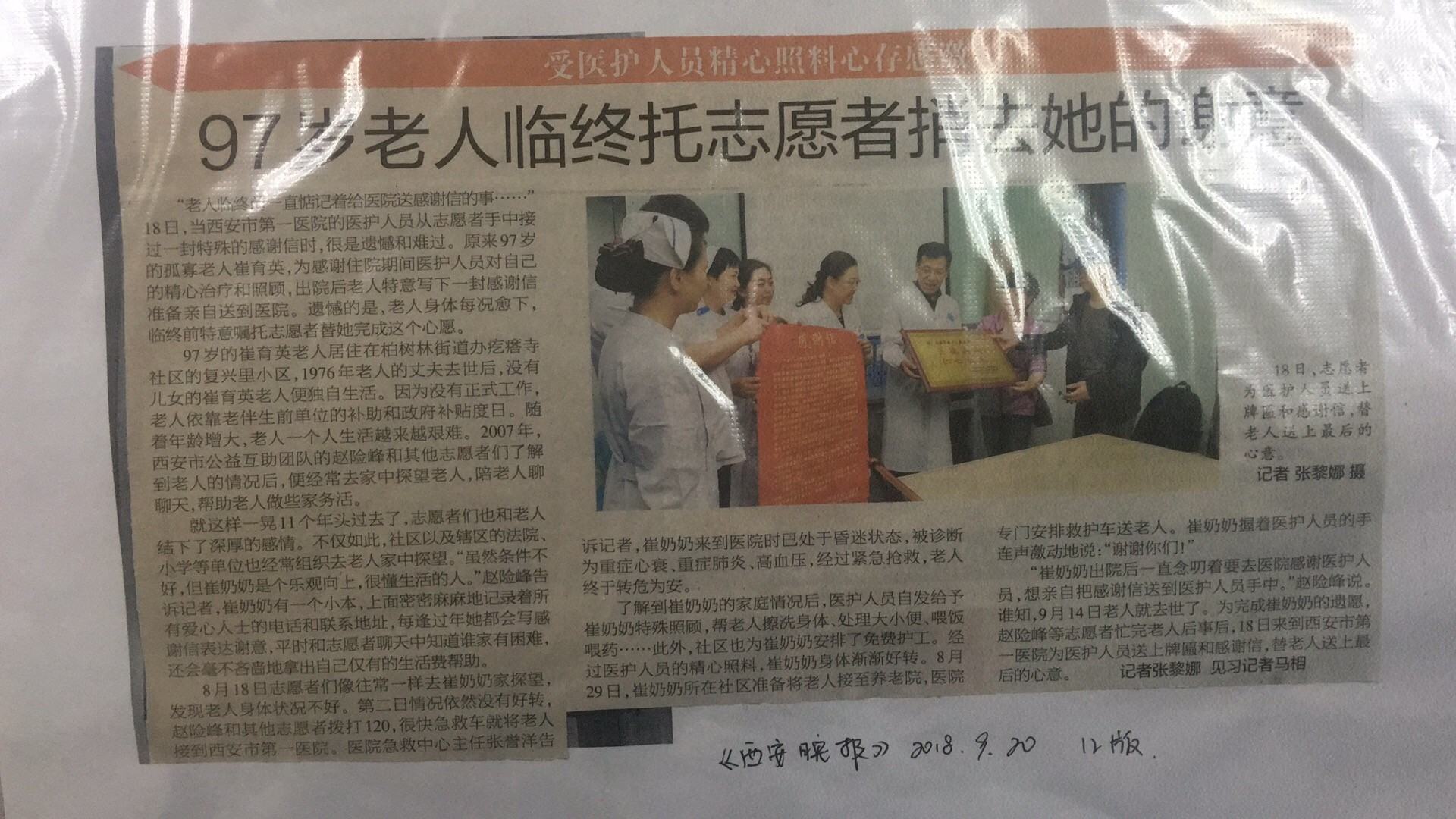 2018.9.20《西安晚报》97岁老人临终托志愿者捎去她的谢意