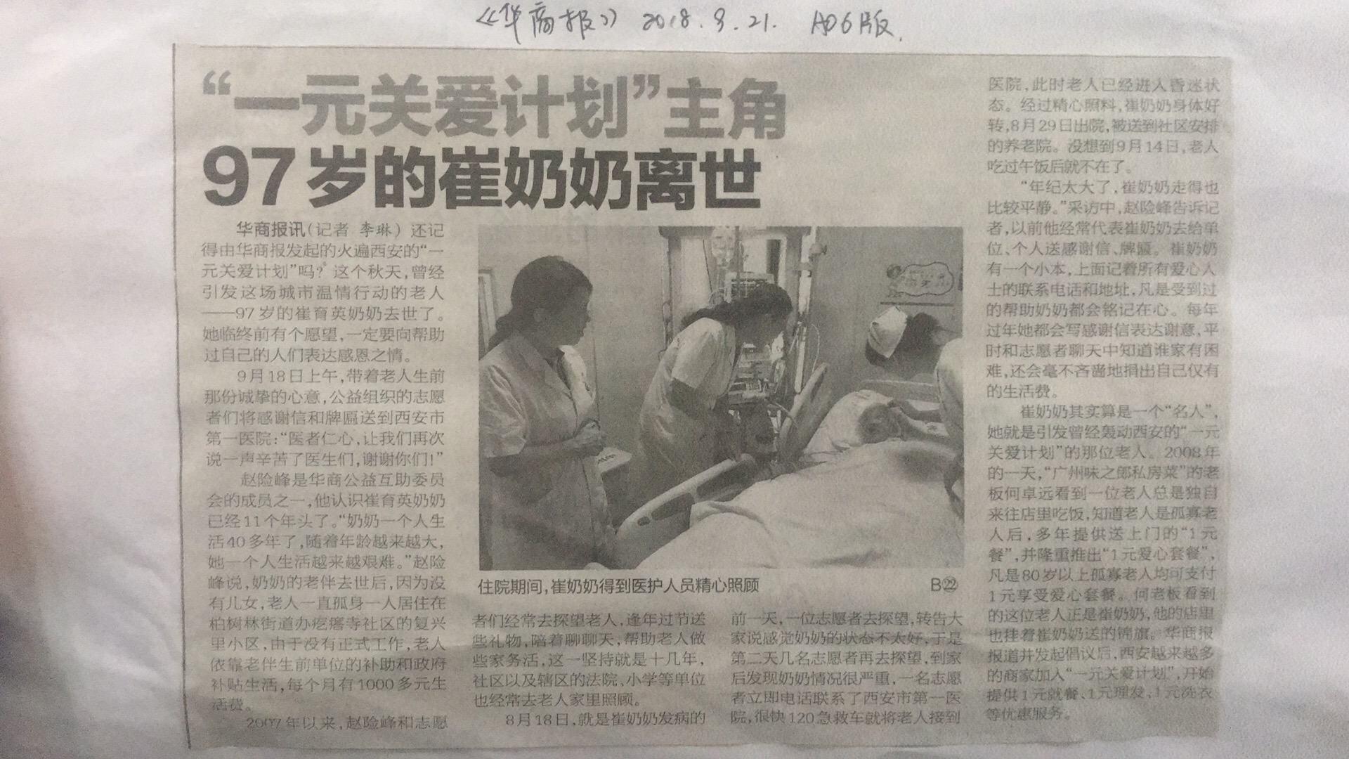 《华商报》2018.9.21“医院关爱计划”主角97岁的崔奶奶离世