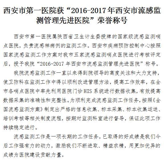 男同视频 获“2016-2017年西安市流感监测管理先进医院”荣誉称号