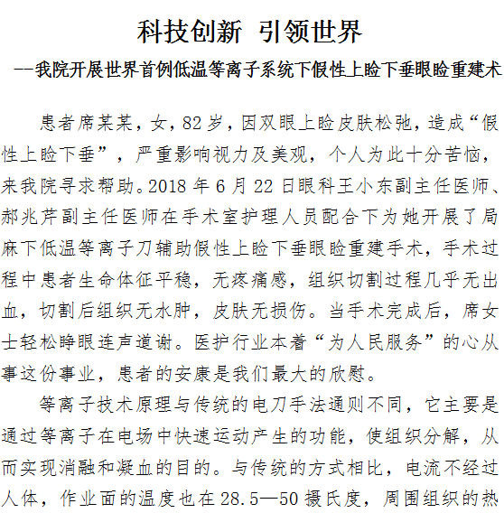 科技创新 引领世界 --男同视频 开展世界首例低温等离子系统下假性上睑下垂眼睑重建术