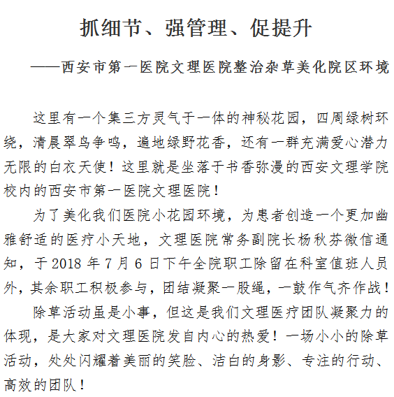 抓细节、强管理、促提升 ——男同视频 文理医院整治杂草美化院区环境