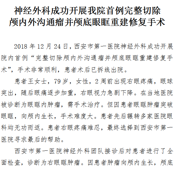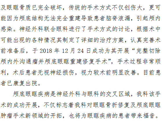 神经外科成功开展男同视频 首例完整切除颅内外沟通瘤并颅底眼眶重建修复手术