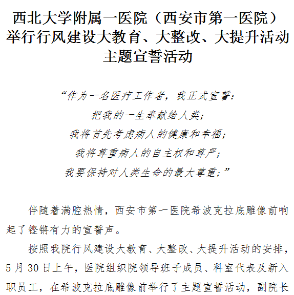 西北大学附属一医院举行行风建设大教育、大整改、大提升活动主题宣誓活动
