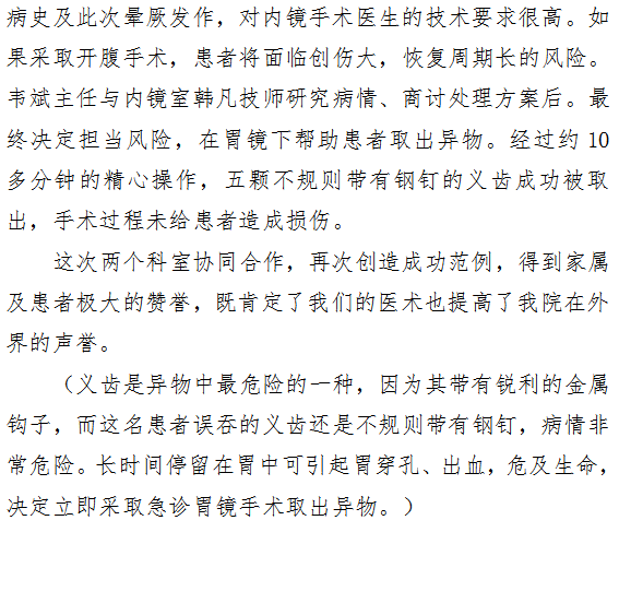科室协同合作 内镜险取断齿