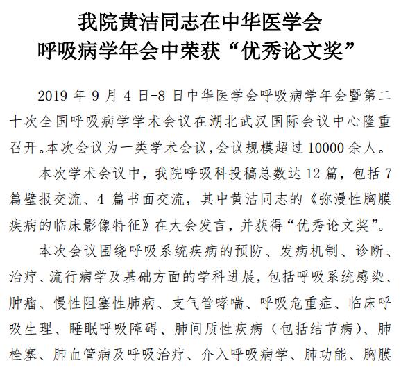 男同视频 黄洁同志在中华医学会 呼吸病学年会中荣获“优秀论文奖”